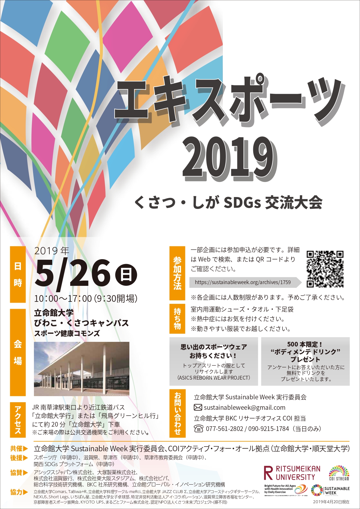2019年5月26日(日)10:00より立命館大学びわこ・くさつキャンパスにおいて、「エキスポーツ2019~くさつ・しがSDGs交流大会」が開催されます。本企画は、サスティナブルウィーク実行委員会の学生とCOIアクティブ・フォー・オール拠点の共催で開催し、誰もが参加できるスポーツイベントやパラスポーツ体験等によって、SDGsの理解を深めていただくことを目的に開催するものです。みなさまの積極的なご...... [続きを読む]